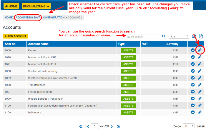 If you adjust or delete accounts, this always applies to the fiscal year you have selected. For example, you can make changes to your chart of accounts in the current fiscal year without affecting older fiscal years.
