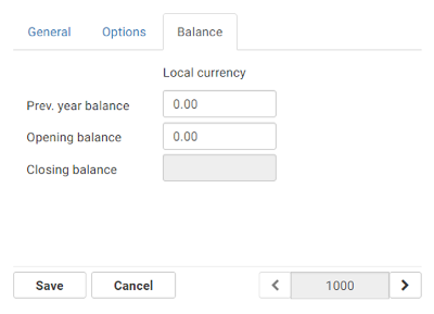 The "Balance" tab shows the balance from the previous year, the opening balance and the closing balance. If you have to start freshly with Pesaris FIBU and transfer balances from another system, you can enter the corresponding balances here. The "Foreign currency" column is only displayed if a foreign currency is stored in the account (--> tab "General").