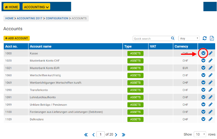 You can quickly move from one account to the next by clicking on the arrows < or > (see figure). This allows you to check the settings of the various accounts very quickly and make changes / mass mutations as required.